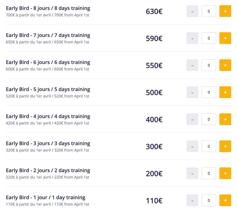Les journées seront rythmées par des entraînements de 10h à 16h, suivis d’une session libre optionnelle jusqu’à 18h, pour prolonger l’expérience à votre rythme.