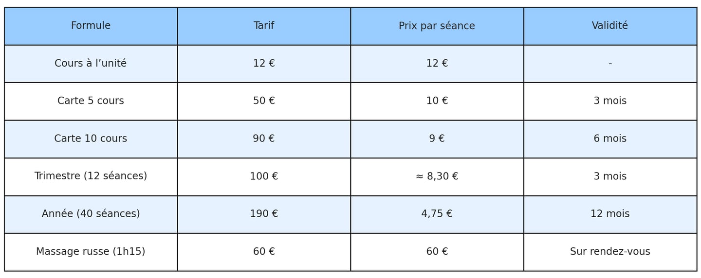 Les cartes vous offrent la souplesse de venir quand cela vous convient, dans la limite de leur durée de validité. Le forfait annuel, quant à lui, est idéal pour progresser régulièrement tout en bénéficiant du tarif le plus avantageux.